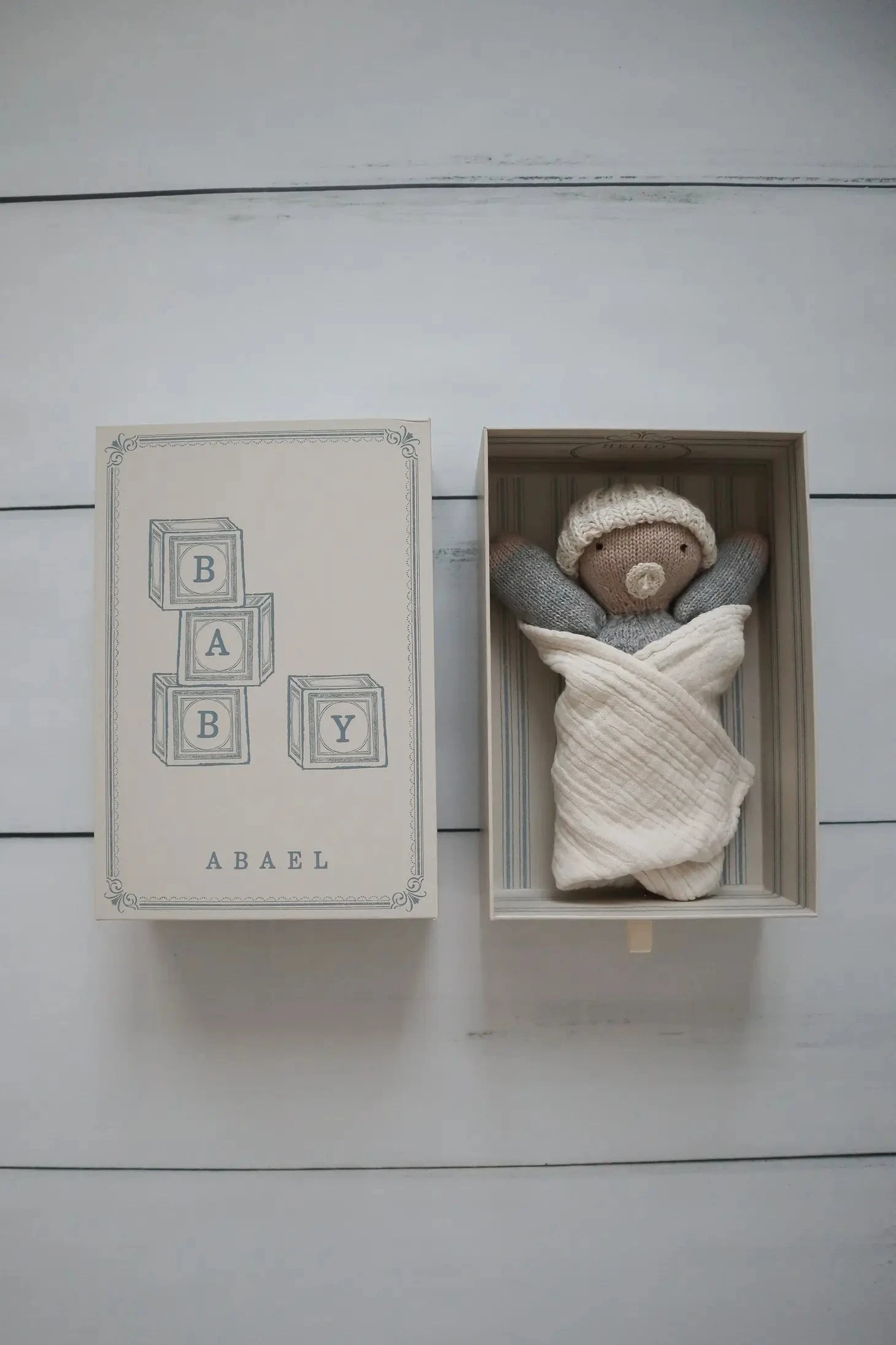 Each doll comes with a complimentary, 100% organic cotton gauze swaddle. Your newborn keepsake will arrive all bundled up inside our beautiful keepsake box. Perfect for gifting! Due to our dolls’ handmade nature, no two dolls look alike, or are completely symmetrical! It is the asymmetry that gives each doll character and makes it unique. If your doll arrives a little flat, it just needs a little fluffing after it’s voyage in the shipping box.