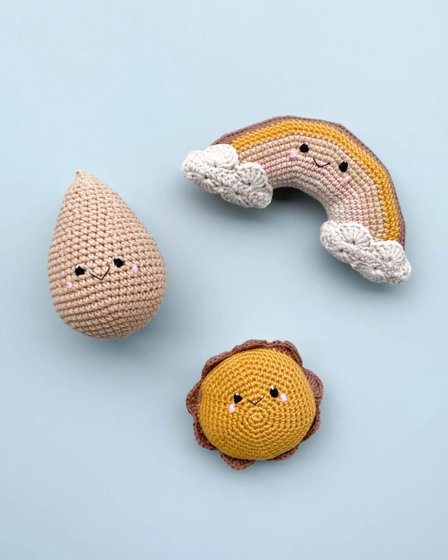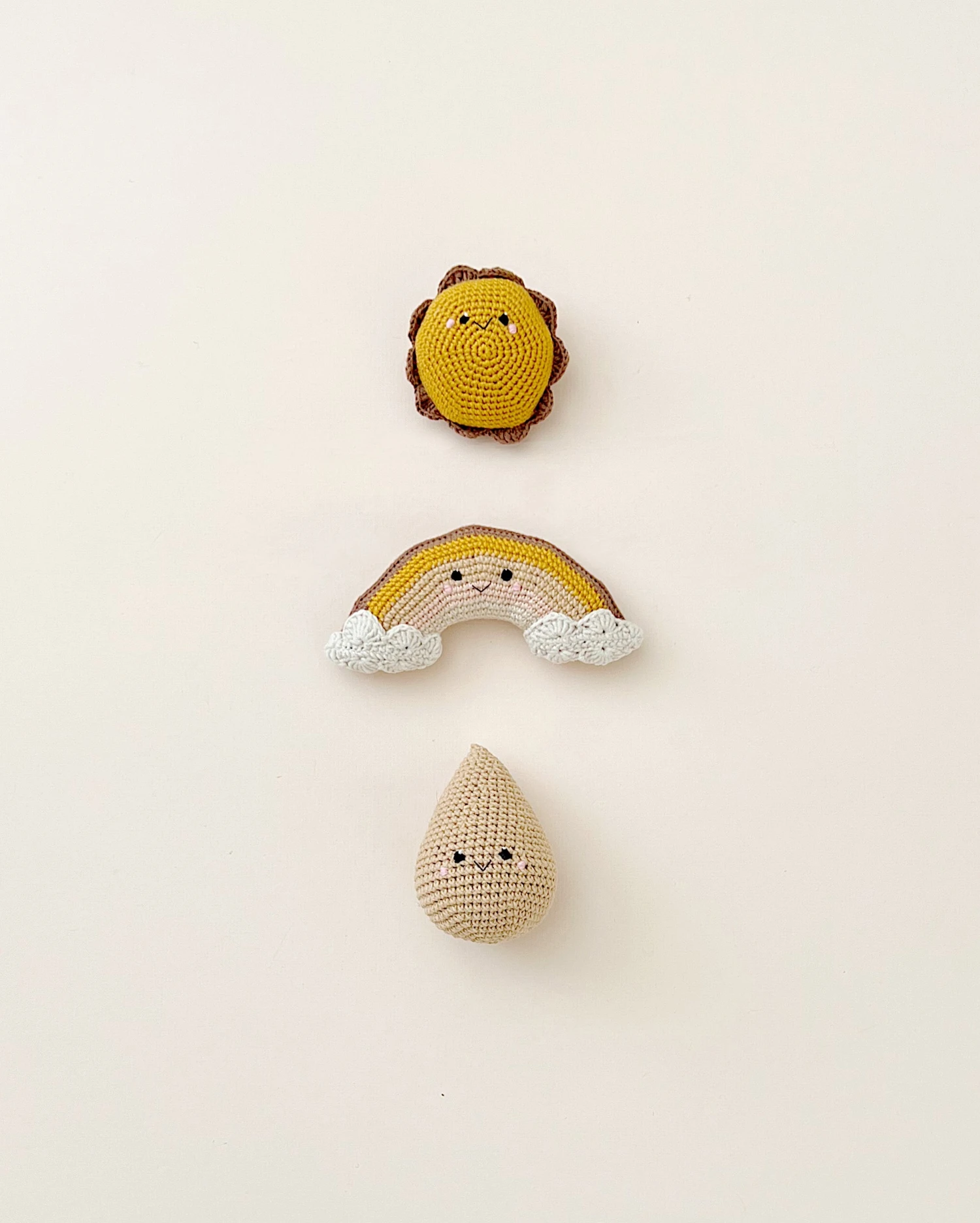 This set includes a sun rattle, rain drop rattle and a rainbow rattle.