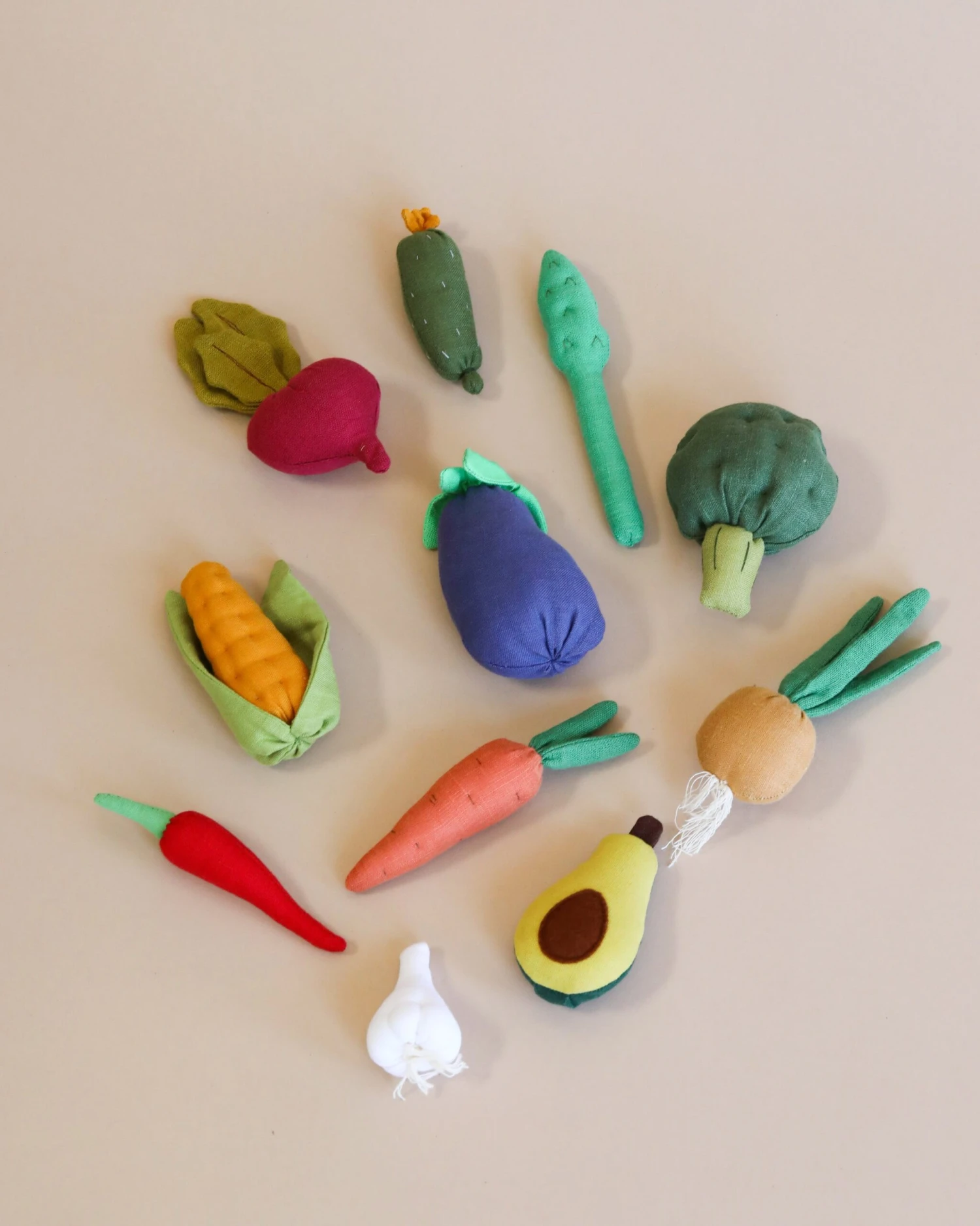 11 hand-crafted veggie toys, perfect for role-play kitchen fun!