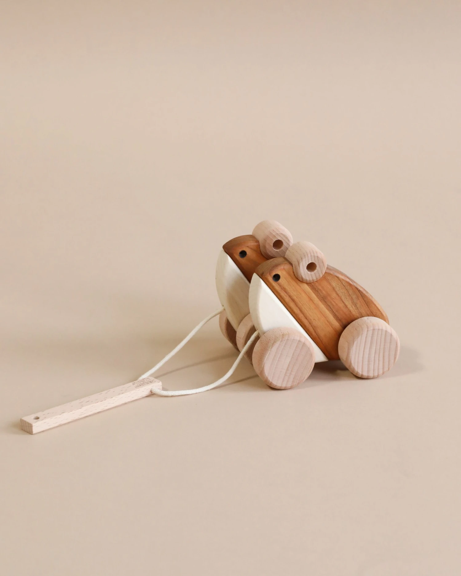 The two frogs take turns bobbing up down, appearing as if the they are hopping together. The children will love to pull this toy along, watching as these two froggies hop along smoothly across the floor. This toy imitates the motion of its real life counter part.