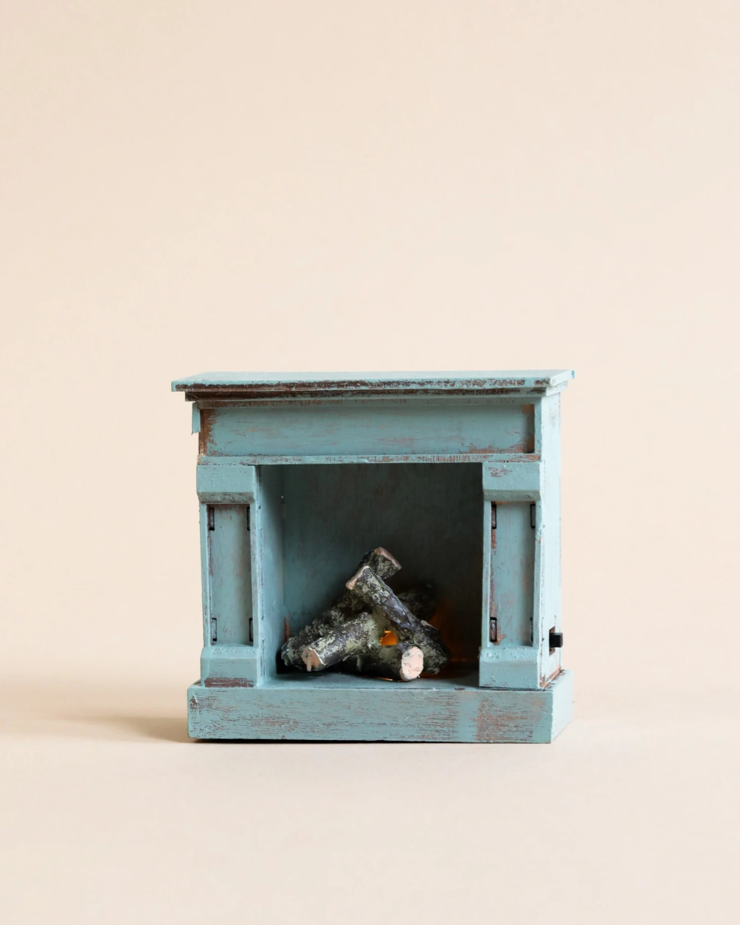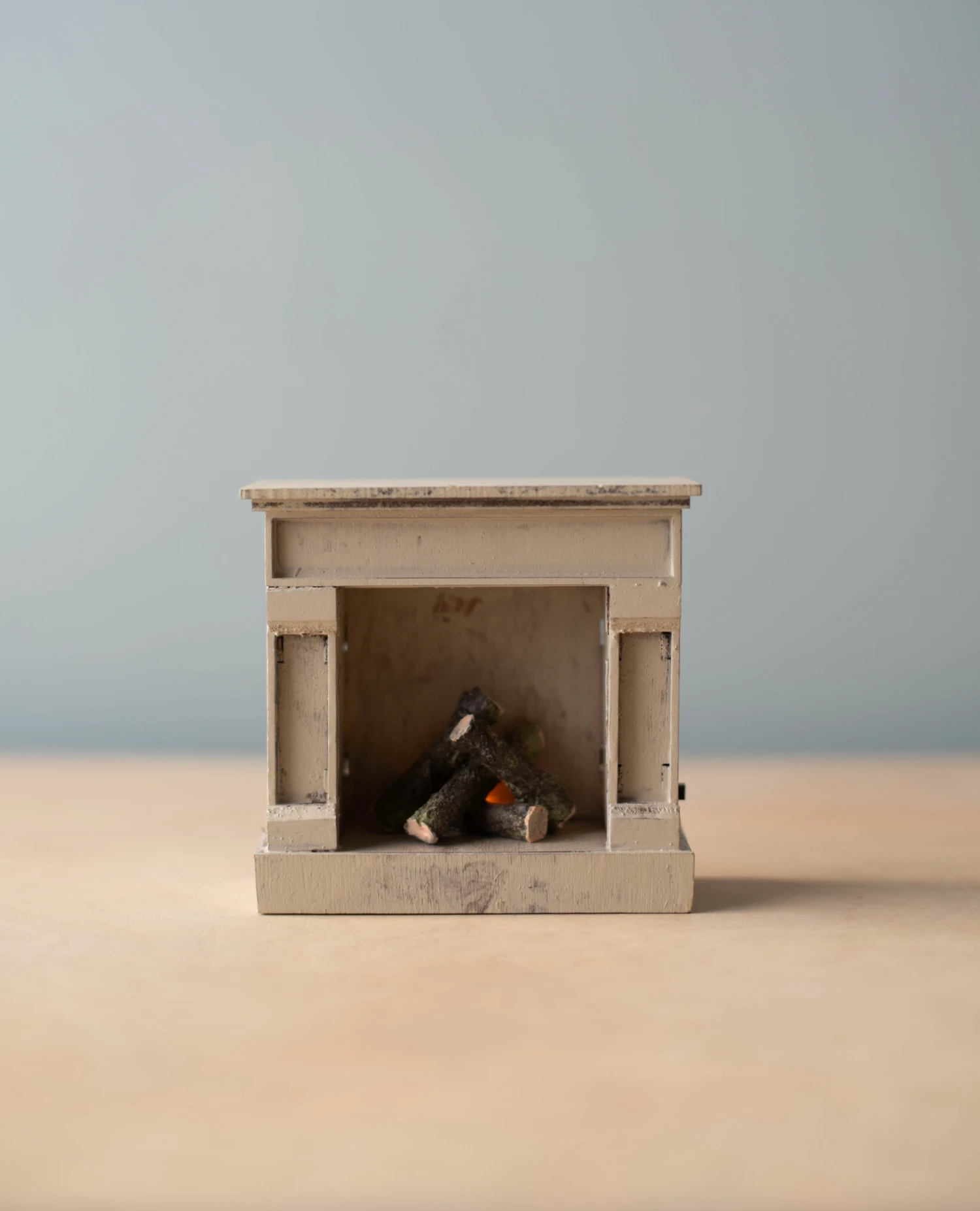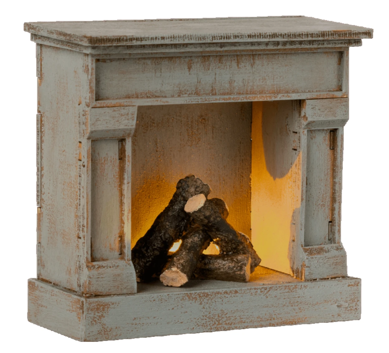 Introducing Maileg fireplace design! This adorable fireplace is so cozy with it’s flickering fire and vintage painted look. Help your mice stay warm and relax by our vintage style fireplace. It includes a switch to light up the fire, and has a spot to change the batteries.
