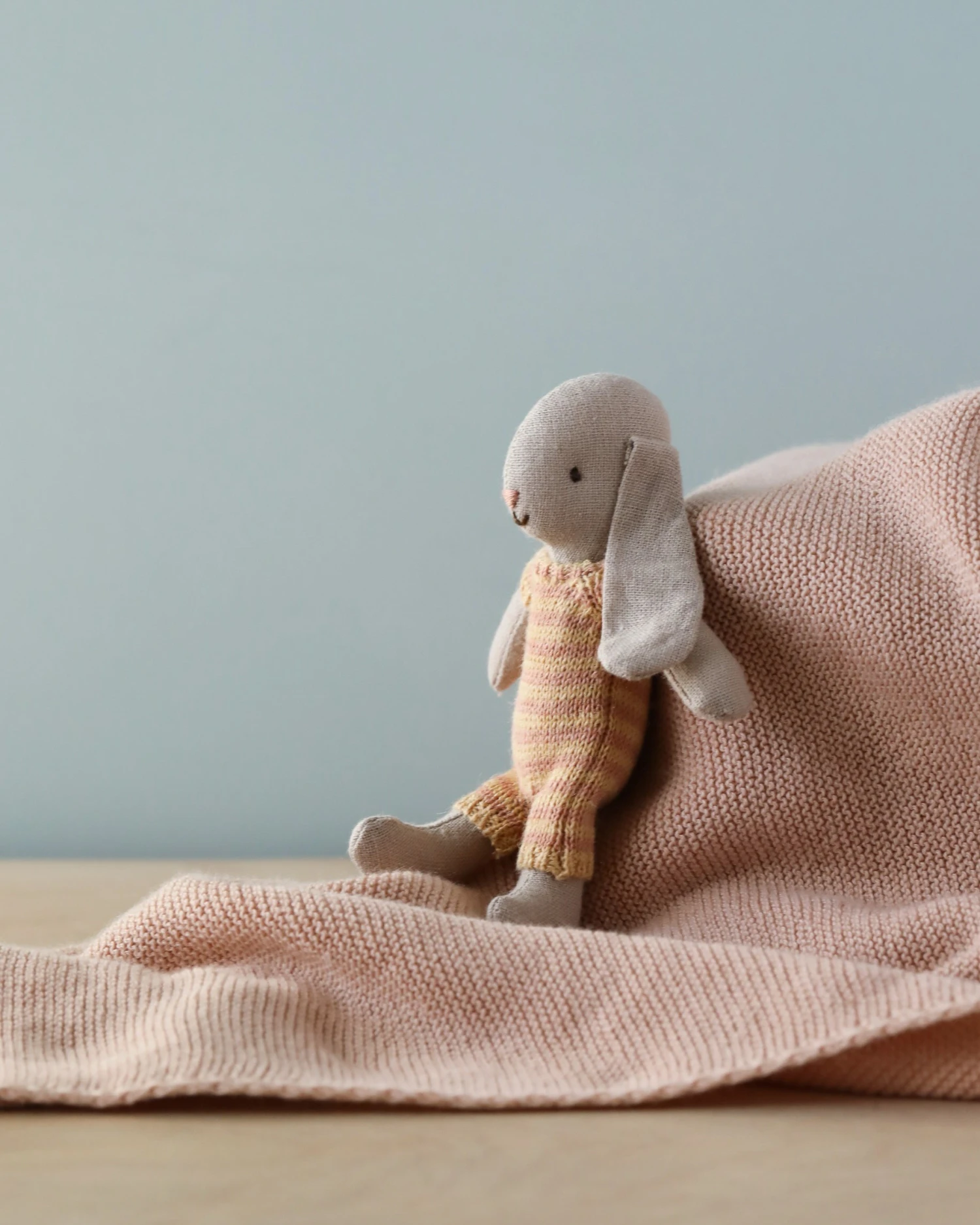 This sweet bunny in micro size is dressed in a striped suit knitted in a soft linen/cotton blend. It fits all the micro size furniture and will surely lead to many hours of play! The knitted suit is made in 3 lovely color combinations.