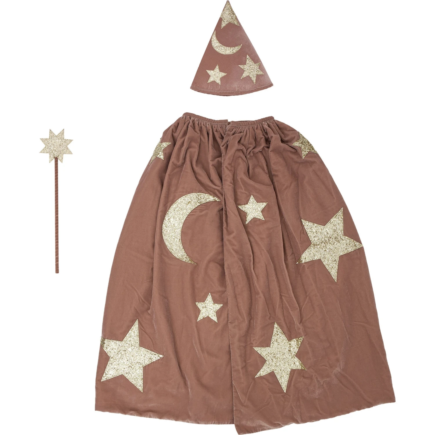 The combination of luxurious pink velvet, with gold glitter fabric stars and moons, makes this costume very special. Simply wrap around the cape, pop on the hat, and wave the star topped wand, to look like a wizard in seconds. It’s perfect to wear to parties, or for imaginative play.