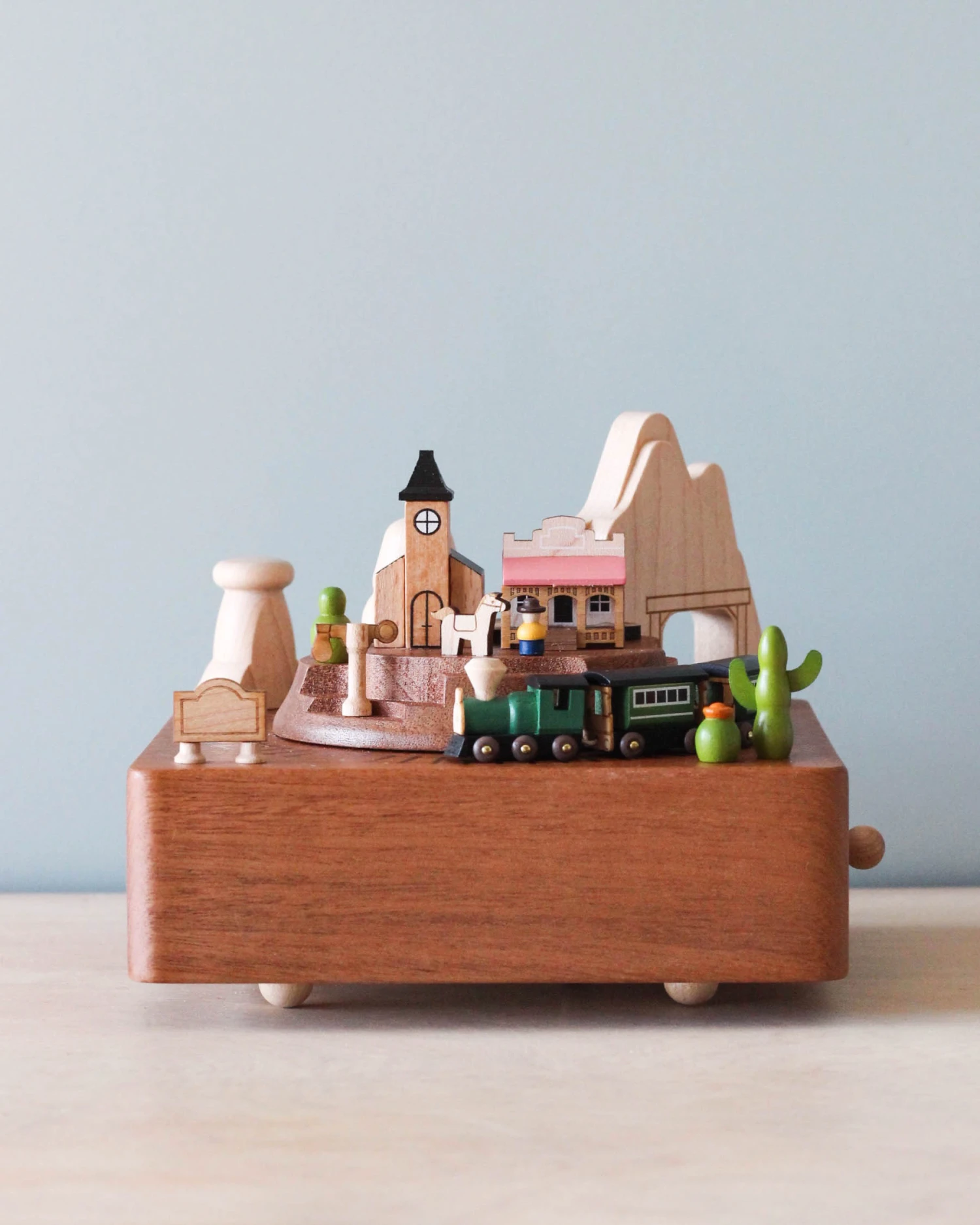 Combining nostalgia and a classic design, this hand cranked music box makes a great addition to any room or as a decoration on a shelf. The on/off toggle allows the music to start and turn off easily, while the clockwork mechanism enables the train to go around while the music is playing.