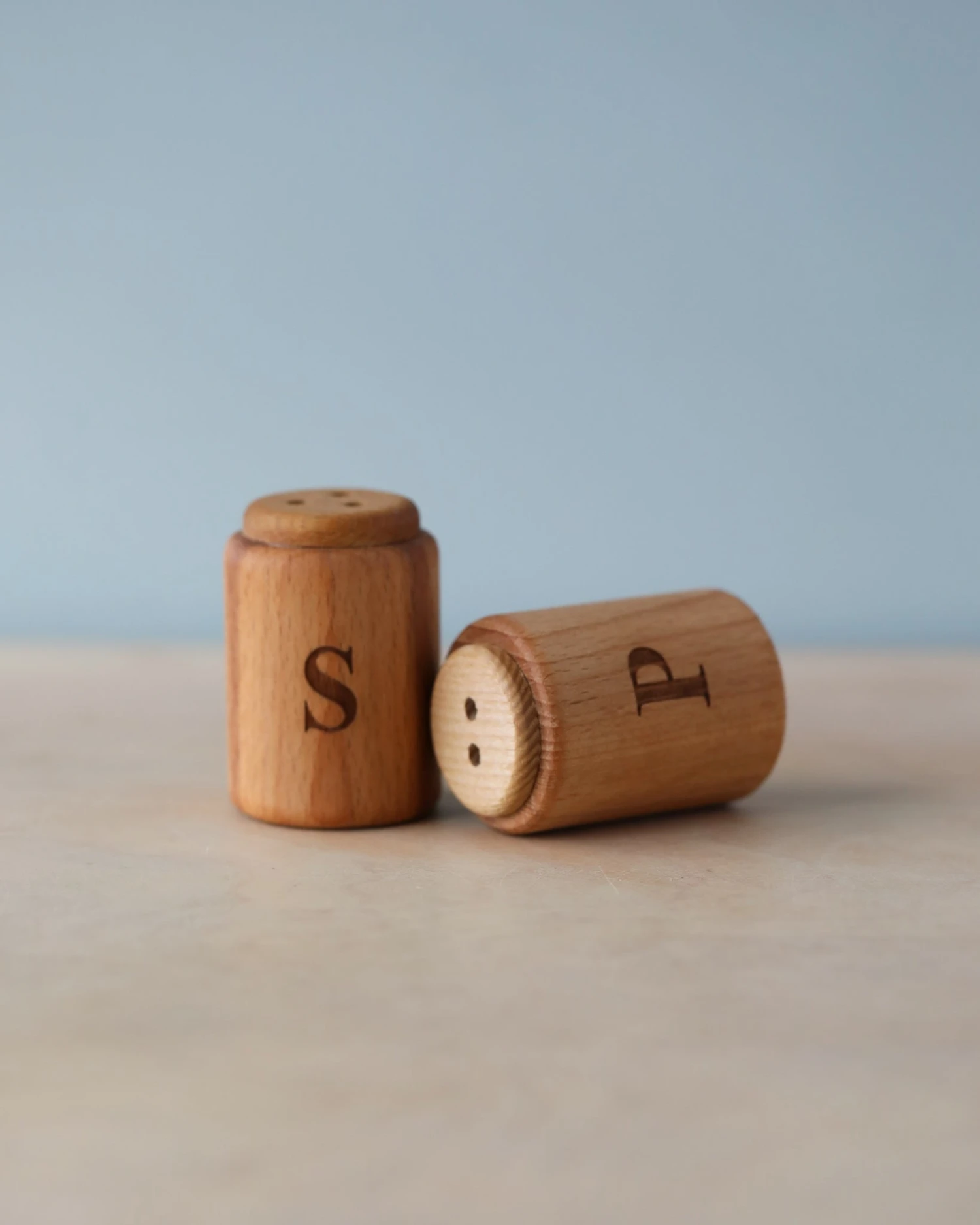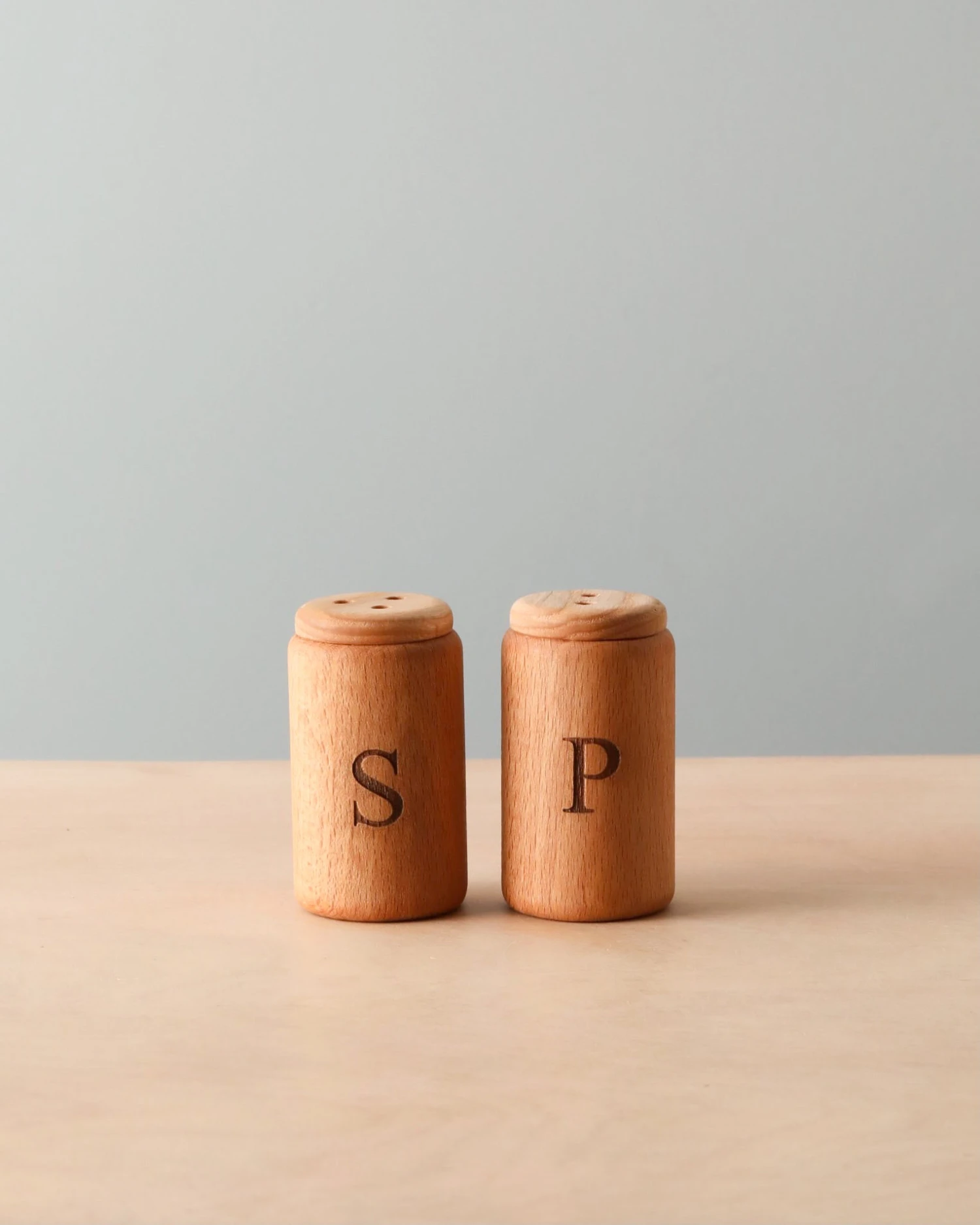 Handmade from ash wood, this salt and pepper shaker will make a rattling noise when you shake them!