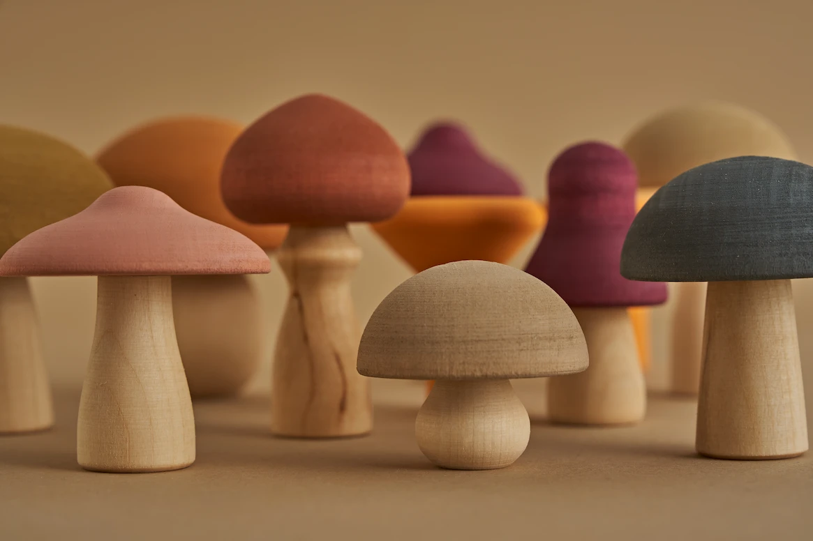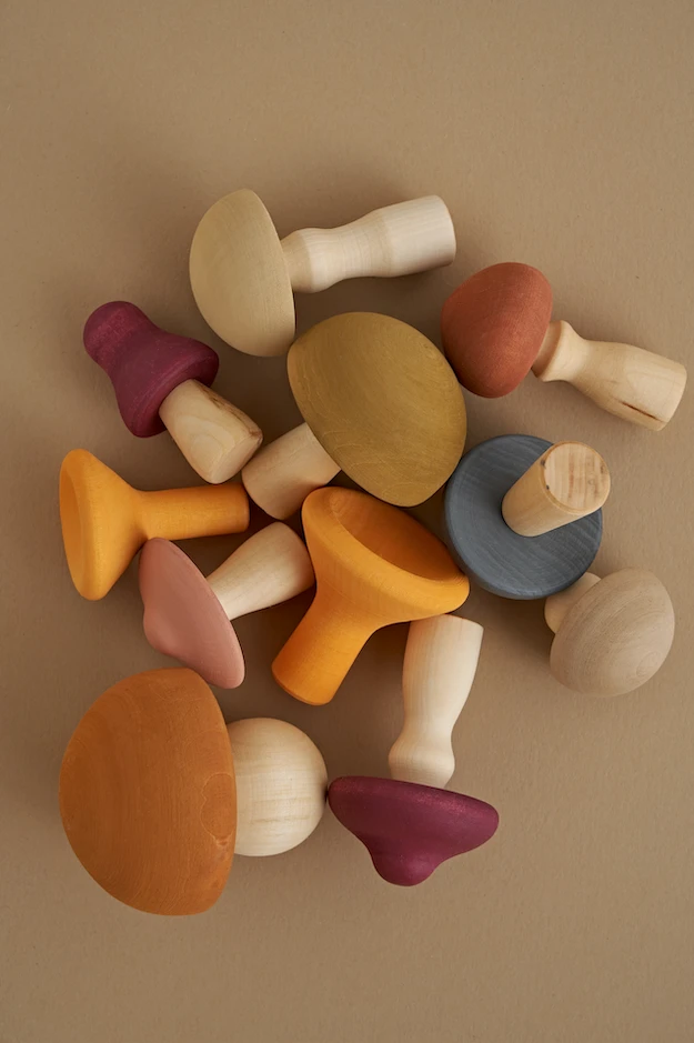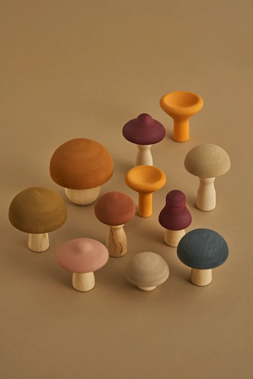 Contains 11 mushrooms, handmade in Russia by Raduga Grez, from lime wood wit non-toxic paint.