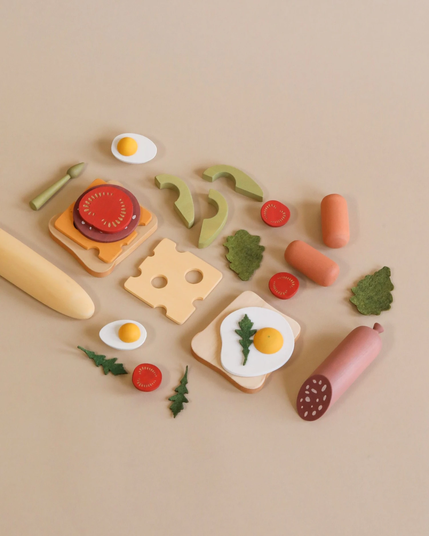 Fried egg: 8 cm / 3.15 inches Baguette: 17 cm / 6.7 inches Toast: 7 x 8 x 1 cm / 2.75 x 3.15 x 0.39 inches Paint: non-toxic water-based paint Recommended age: from 3 years Material: wood (linden or birch)