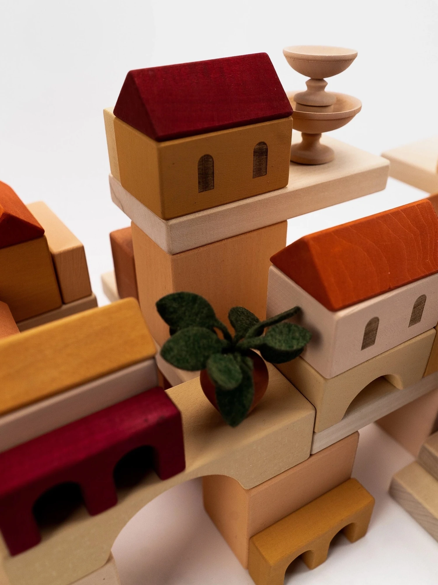Bringing Italy to life, Sabo Concept Courtyard Blocks create a mini-metropolis you can see and feel. With vibrant colors, just like those in serene Italian seaside towns, the set offers a ton of pieces to craft a cityscape without limits. Blocks, plates, houses with windows, stairs, arches, and columns are all here.