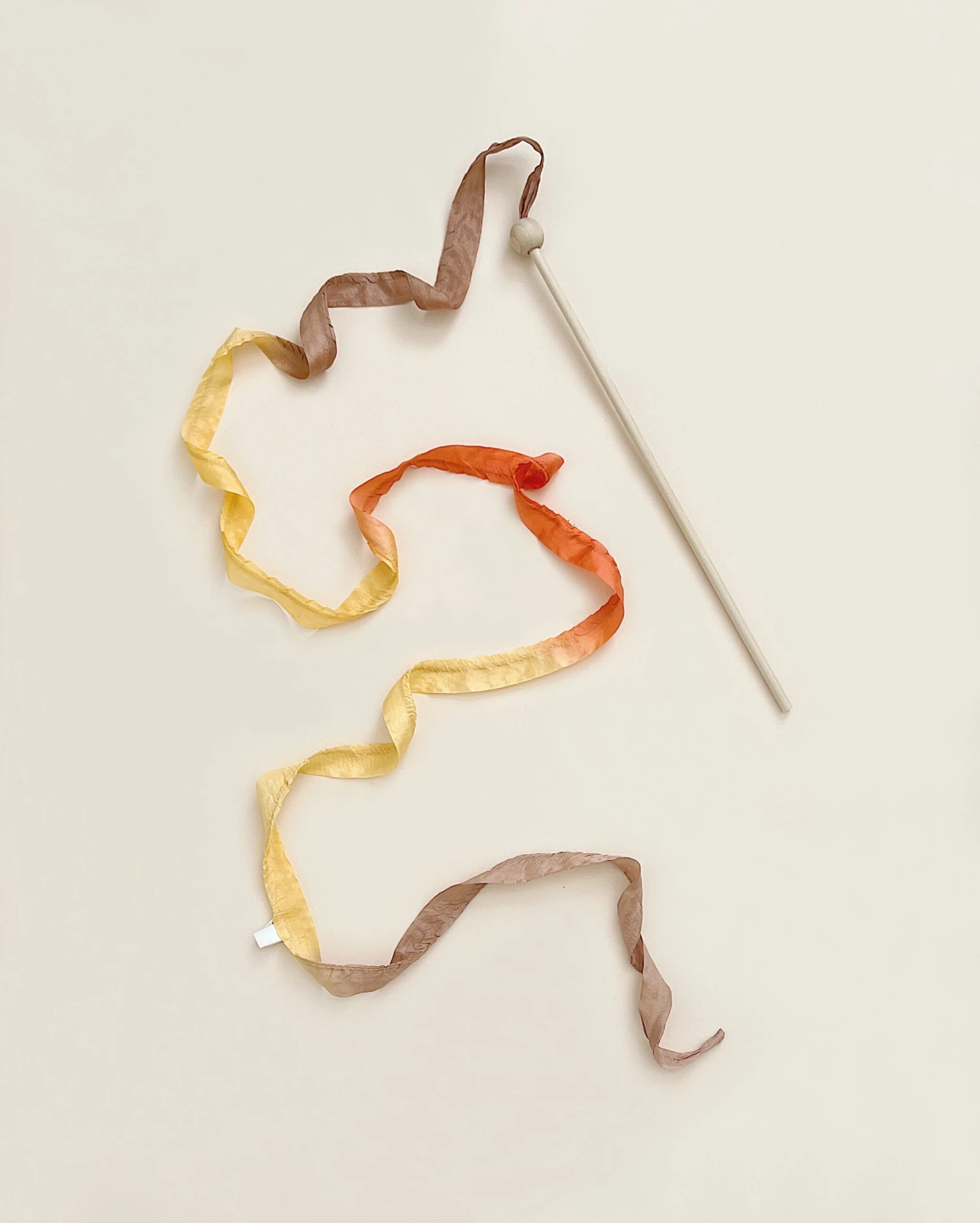 The Rainbow Streamer is a 16-inch long birch wood wand topped with a decorative wooden bead and an 8-foot long x 1-inch wide Rainbow Silk Streamer.