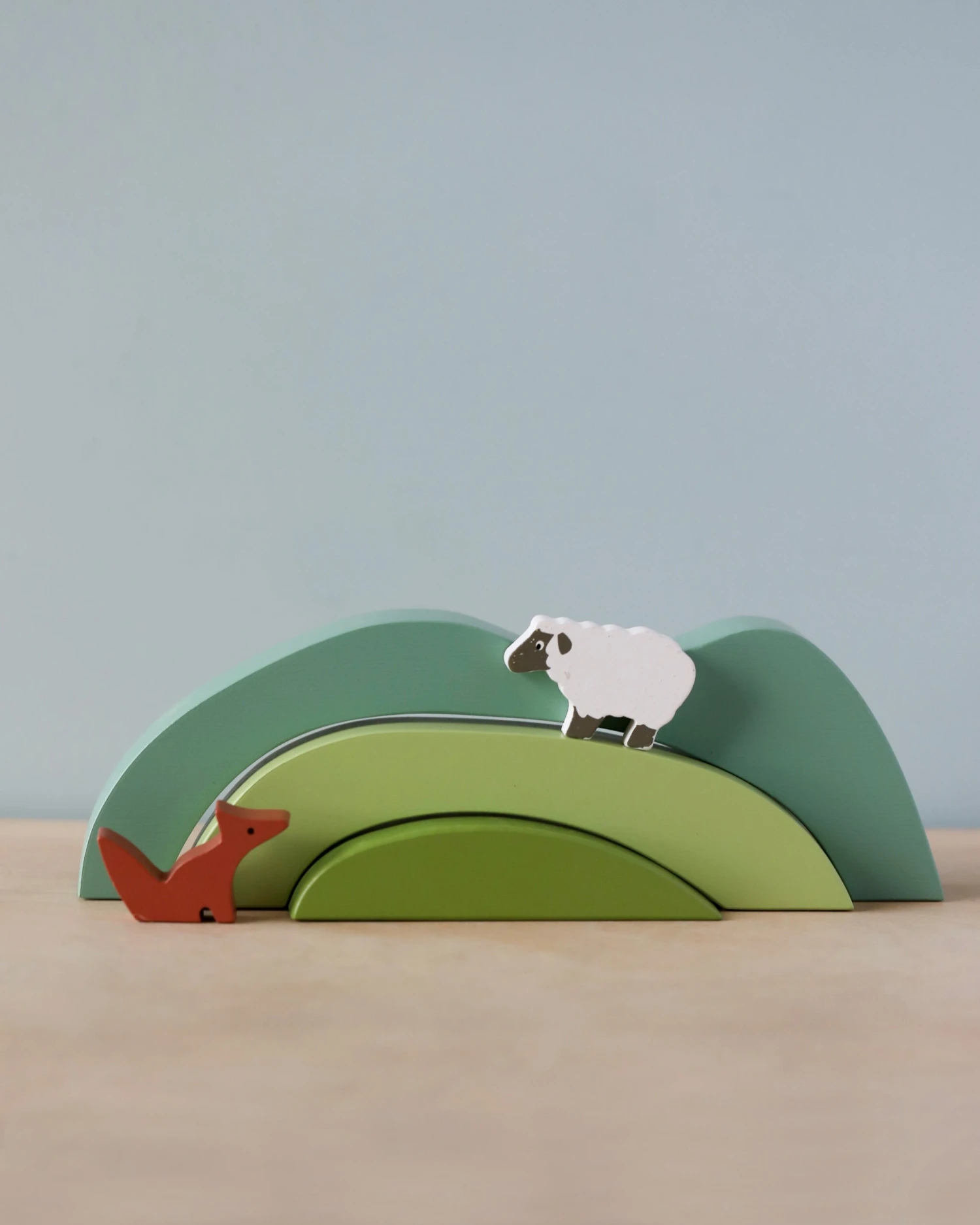 Perfect for displaying your animals, three green solid wood hills that can be used as part of open-ended play. Included are a fox and a sheep.