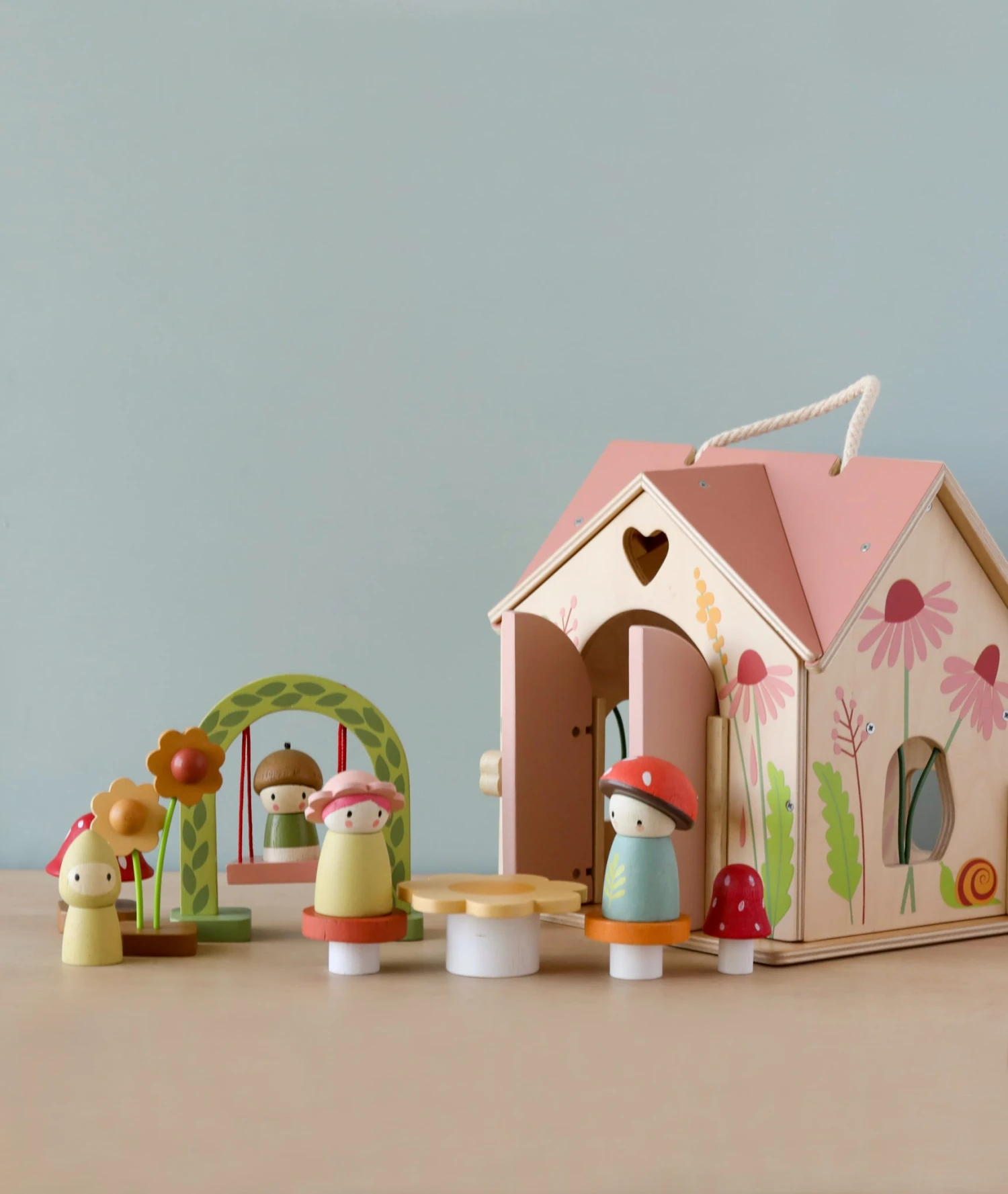The cutest woodland cottage you ever did see. With a rose colored gabled roof, opening front doors and a removable back panel, this little house can be carried to be played with anywhere. Decorated on all sides with beautiful wild flowers, and two cut out windows which allow the flower stems to run through creating a magical meadow look. The back panel lies flat to become a garden, on to which can be placed a pretty swing, 2 flowers, and a toadstool. We have included a wood burning stove, flower table, 2 button stools, a toadstool lamp and a side table. Tuck Bud up in his leafy fabric bed, or push Corny on the swing while mummy Flora and Daddy Joey watch the stars go by.