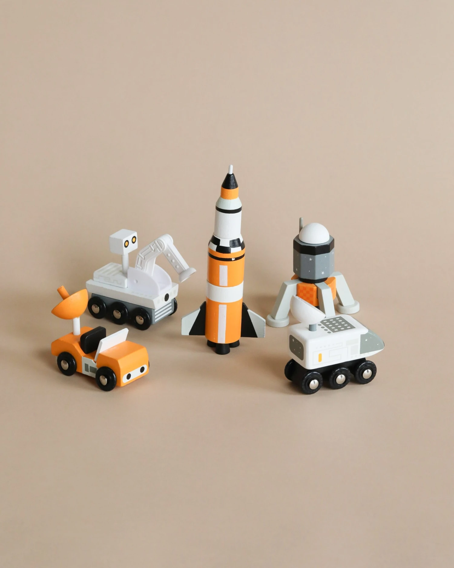Solid wood space vehicles for inter-galactic adventures, set includes: a 3-part rocket, a moon landing capsule, a lunar roving vehicle, a launch crew rover, and a lunar probe.