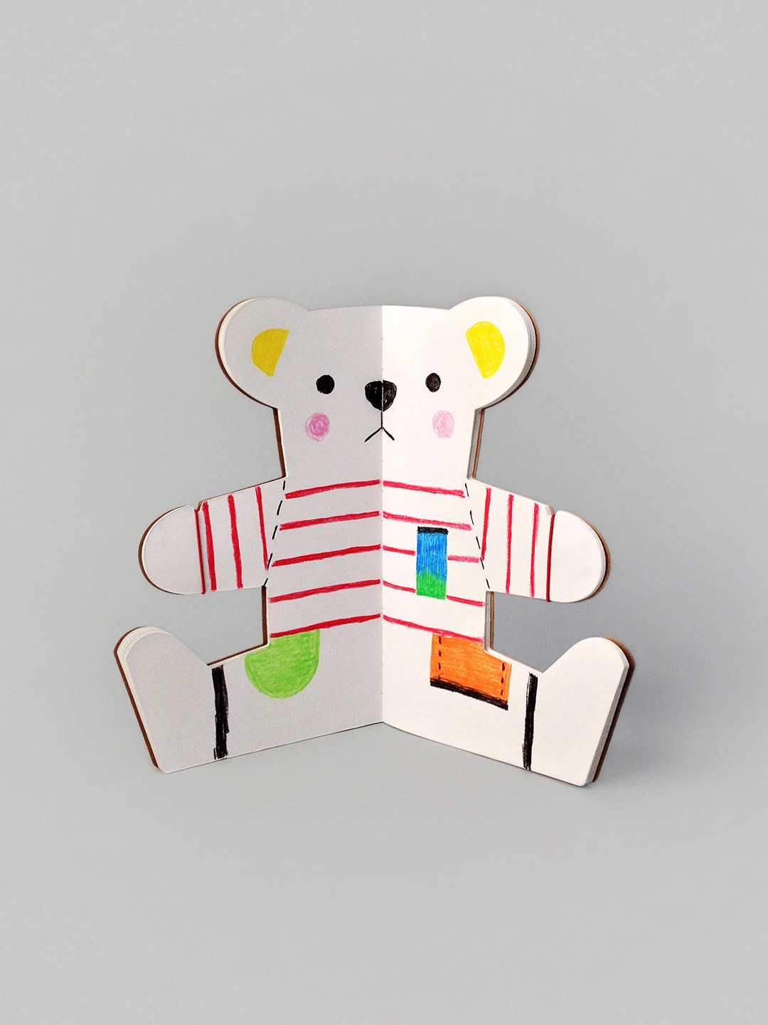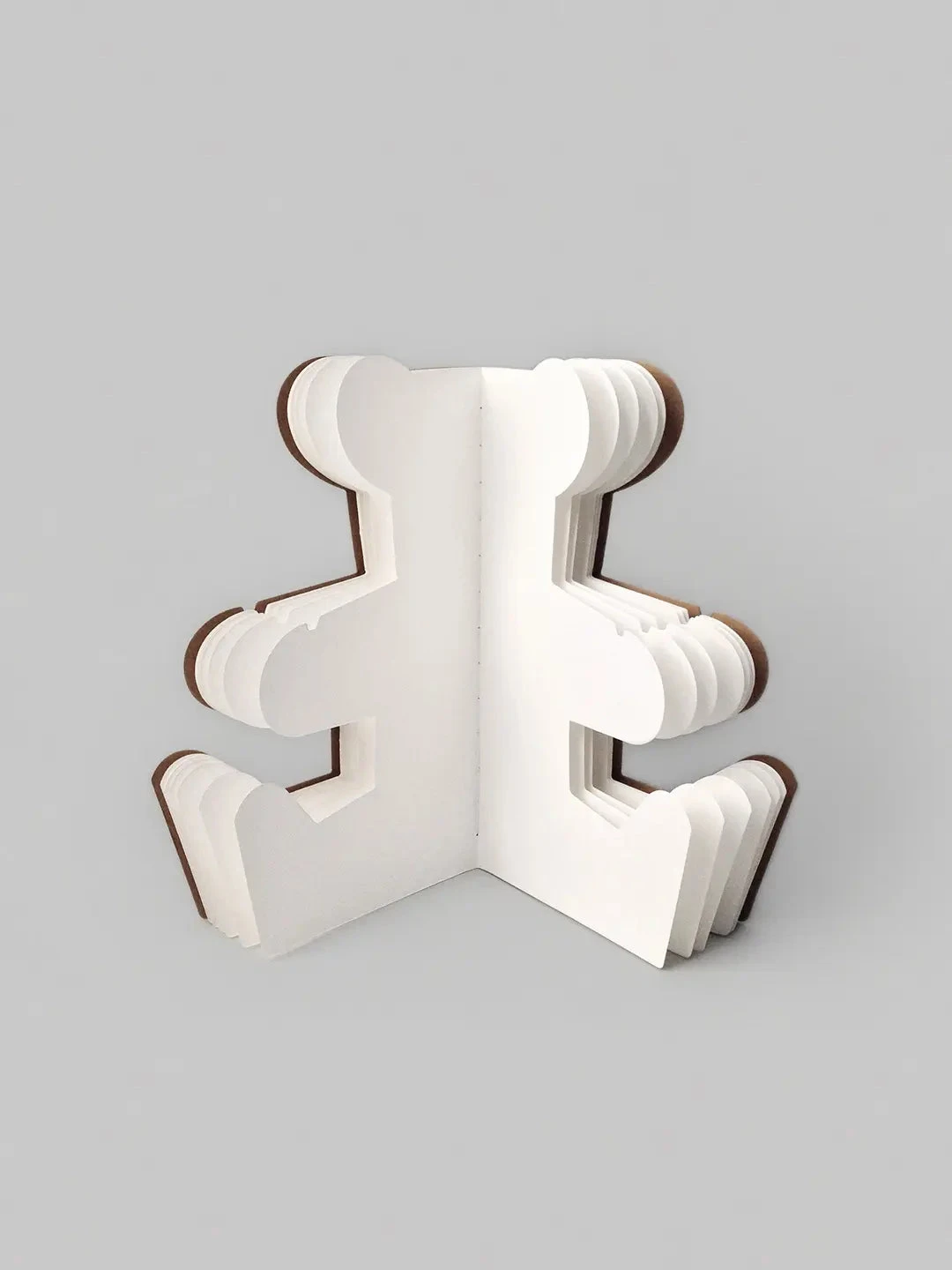 Silkscreen printed cardboard cover, hand-stitched and comes with elastic cords to hold the pages when the bear’s sitting.
