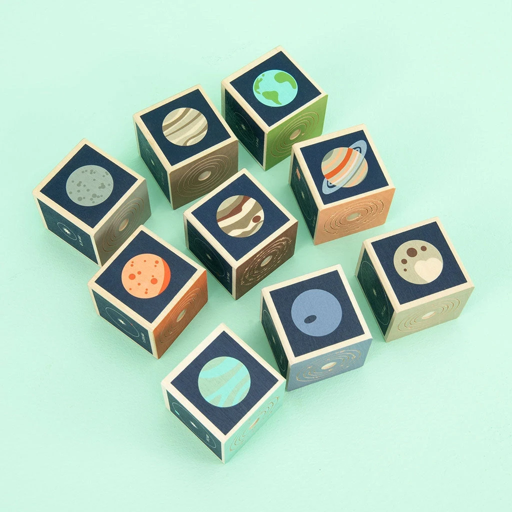 Mercury. Venus. Earth. Mars. Jupiter. Saturn. Uranus. Two debossed sides feature the planet’s symbol, name, and number of moons. The four printed sides reveal a planet illustration, diameter, location, and distance from the sun. This 9 block set honors all 8 planets in our solar system; plus a bonus dwarf planet, Pluto.